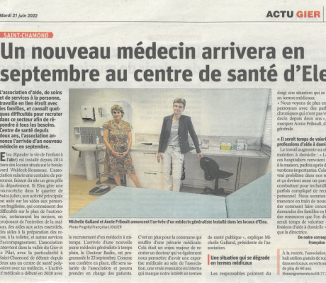 L’association accueillera dès la rentrée de septembre un nouveau médecin généraliste au centre de santé à St Chamond. L’arrivée du Docteur BADIN est programmée le 23 Septembre, elle sera salariée de l’association et présente à temps plein. Pour plus de renseignements, contactez nous au 04 77 29 23 03.